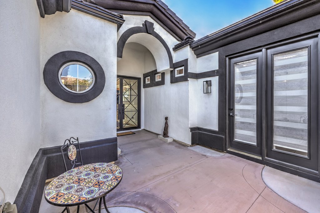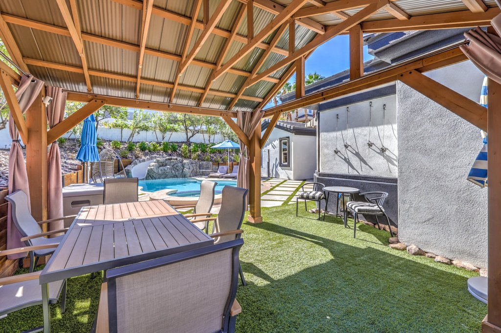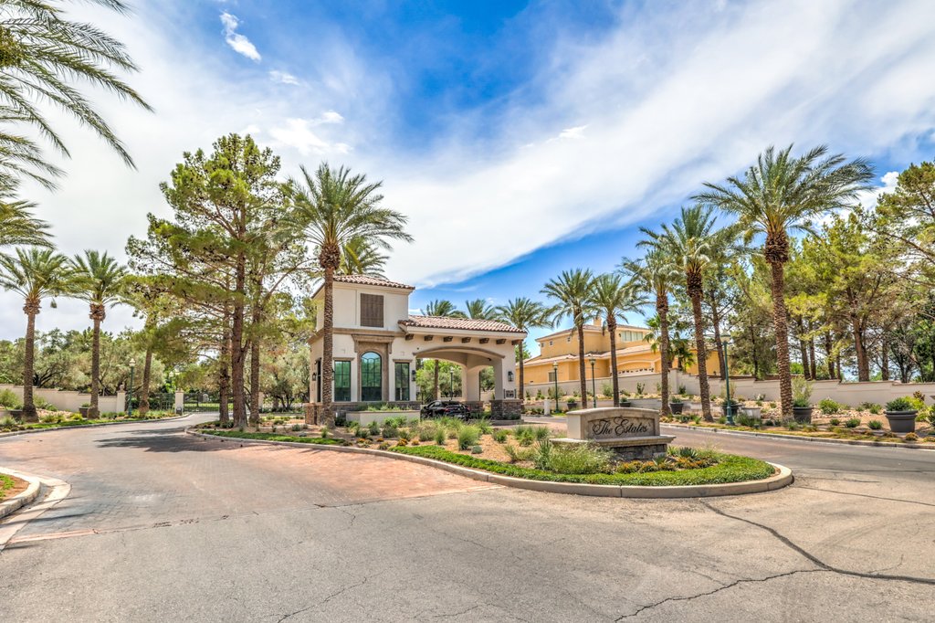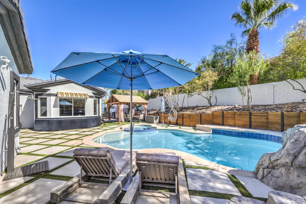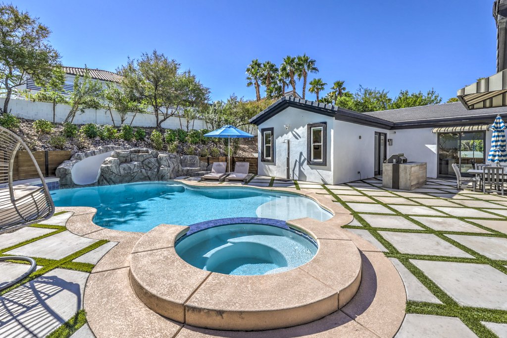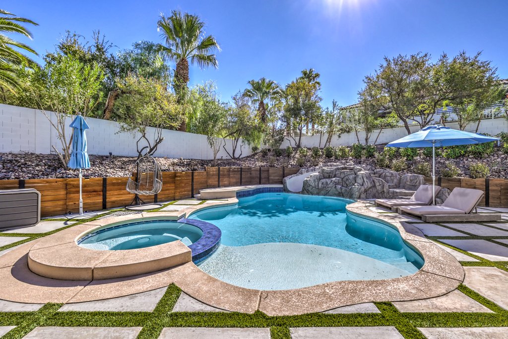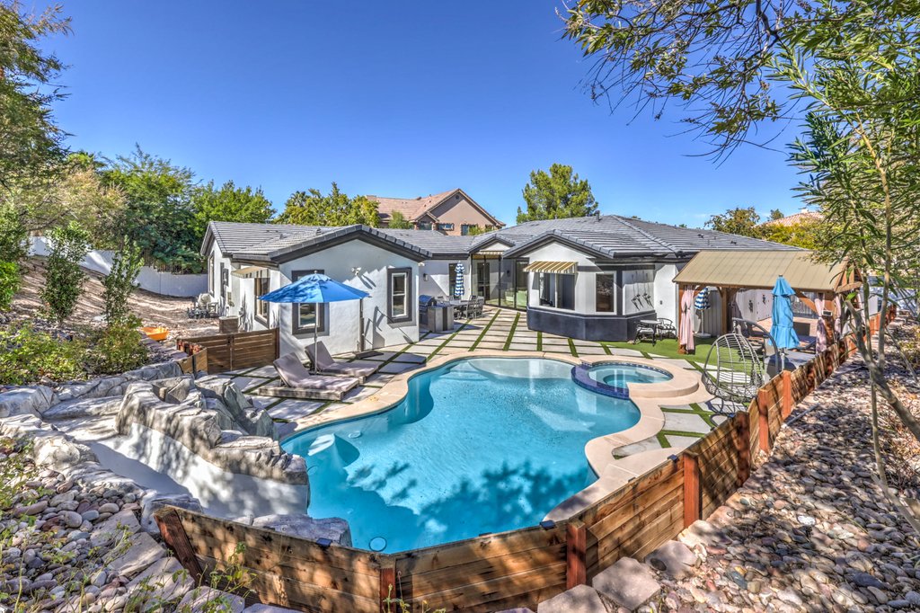 Fully remodeled custom home combines contemporary elegance with a mid-century modern vibe. This turnkey home is offered fully furnished with beautiful, high-end furnishings and select decor. The open concept layout is filled with natural light, ideal for relaxing or entertaining. The gourmet kitchen is highlighted with stacked cabinetry, quartz counters, Kraus sink, island with dining booth, and GE Cafe matte-white stainless-steel appliances. The primary suite is a spa-like retreat thanks to the freestanding round tub, body-jet shower, walk-in closet, and French door to the pool. All bedrooms have an en-suite bathroom, and there is a den for added convenience. Luxurious details throughout include plank floors, zebra shades, wood beams, barn doors, shiplap, linear fireplaces, and 10-foot ceilings. Nearly a half-acre lot is complete with a pool, spa, rock slide, patios, built-in BBQ, courtyard, and an extra-large driveway for plenty of parking. Experience resort-style living with a vibrant and friendly feel in this exclusive guard-gated community of just 86 homes. Perfectly located just minutes from The District, Green Valley Ranch Resort, dining, shopping, desirable schools, parks, trails, and the Vegas Silver Knights arena.
