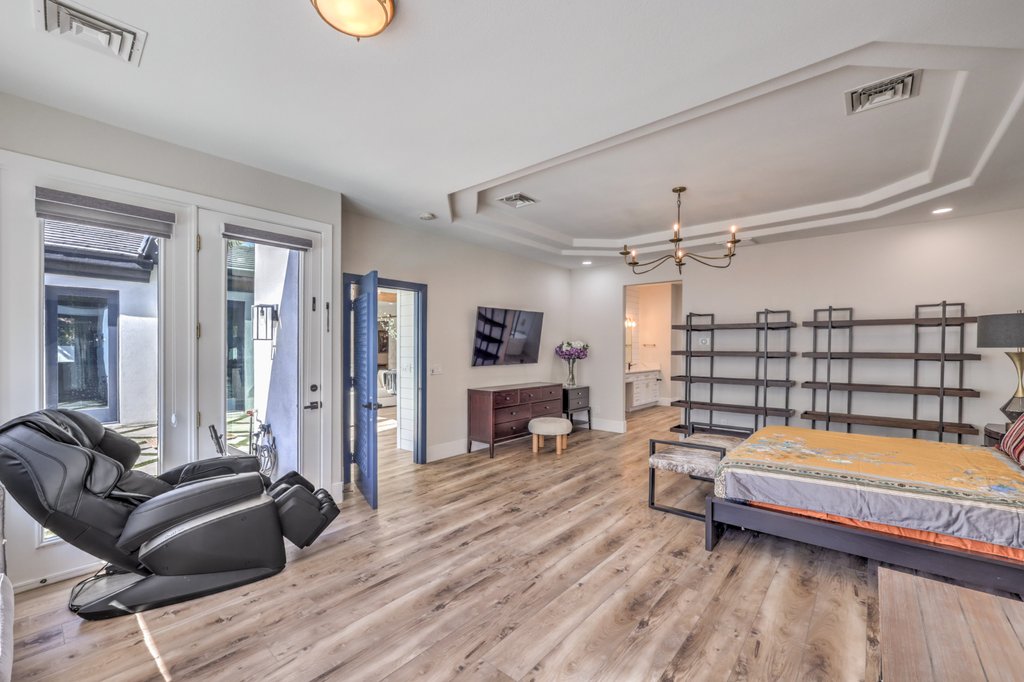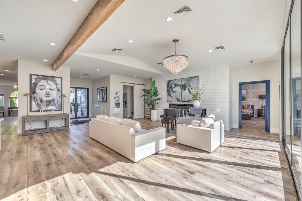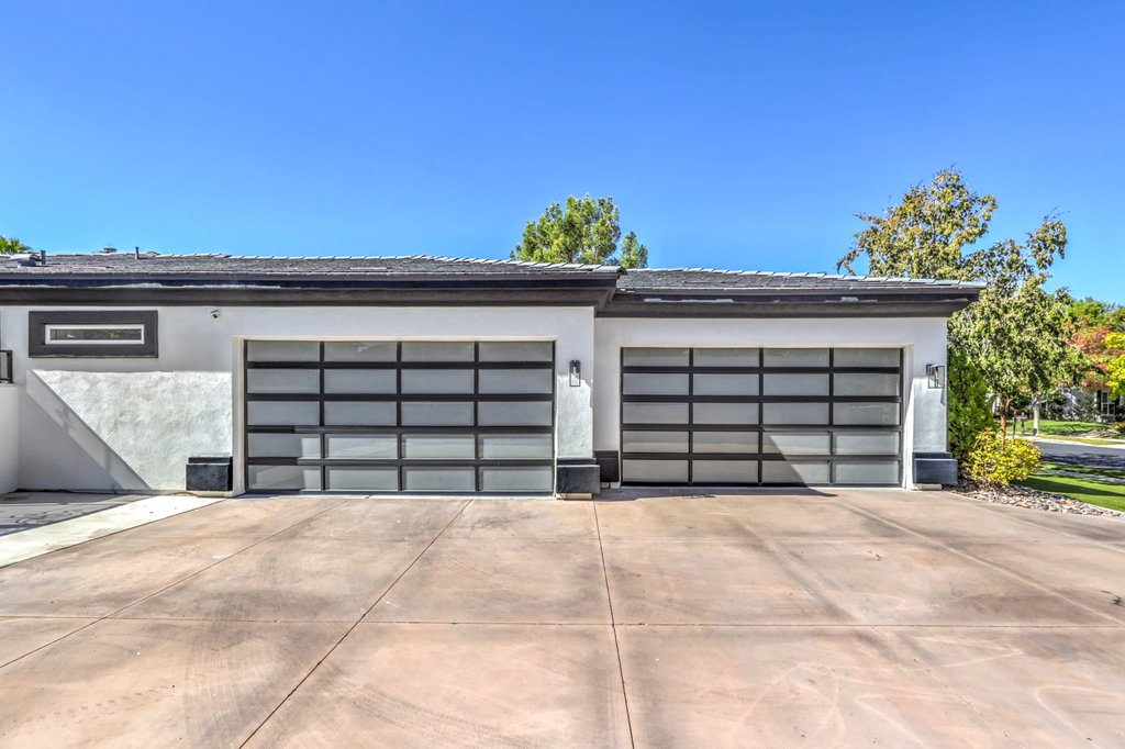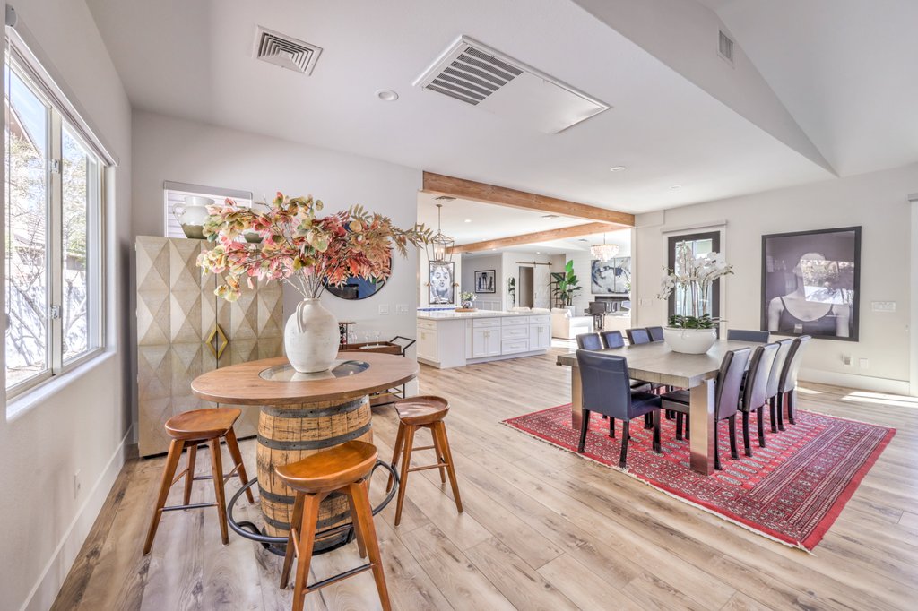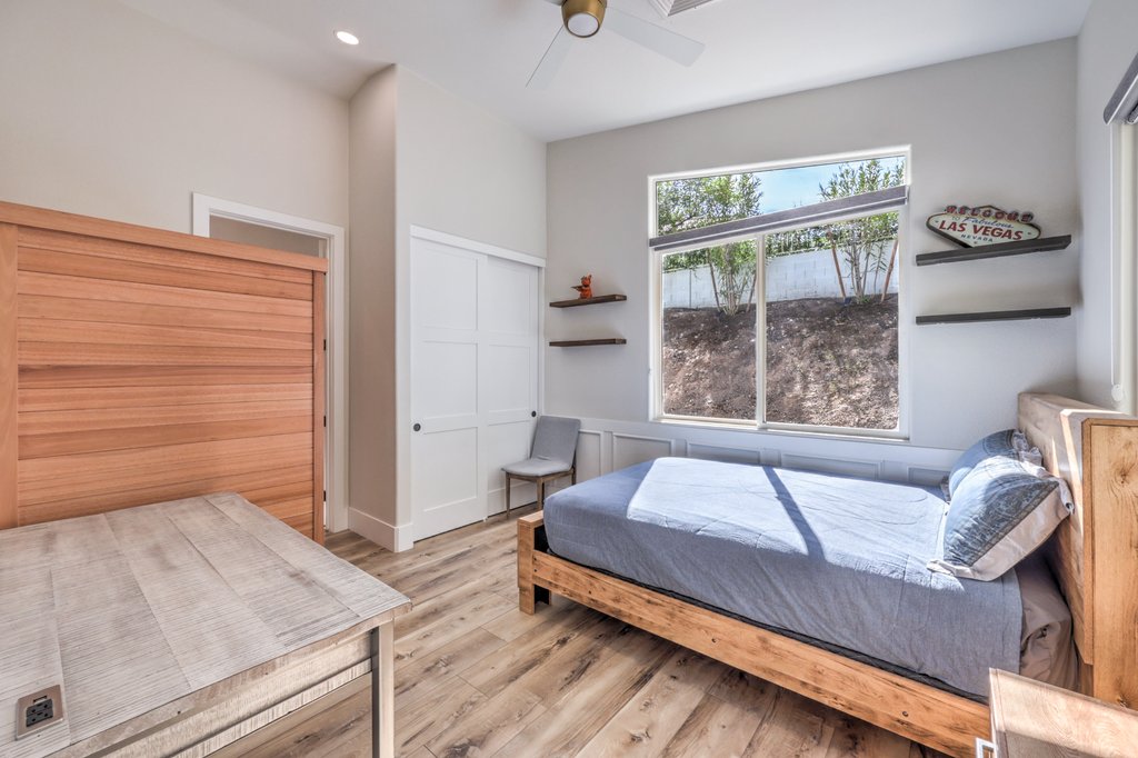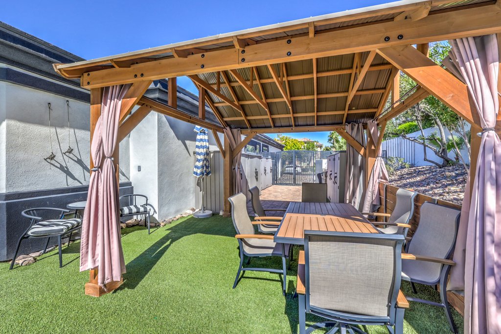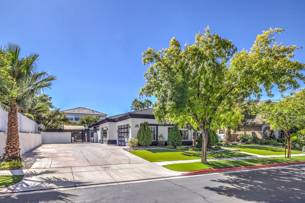 Fully remodeled custom home combines contemporary elegance with a mid-century modern vibe. This turnkey home is offered fully furnished with beautiful, high-end furnishings and select decor. The open concept layout is filled with natural light, ideal for relaxing or entertaining. The gourmet kitchen is highlighted with stacked cabinetry, quartz counters, Kraus sink, island with dining booth, and GE Cafe matte-white stainless-steel appliances. The primary suite is a spa-like retreat thanks to the freestanding round tub, body-jet shower, walk-in closet, and French door to the pool. All bedrooms have an en-suite bathroom, and there is a den for added convenience. Luxurious details throughout include plank floors, zebra shades, wood beams, barn doors, shiplap, linear fireplaces, and 10-foot ceilings. Nearly a half-acre lot is complete with a pool, spa, rock slide, patios, built-in BBQ, courtyard, and an extra-large driveway for plenty of parking. Experience resort-style living with a vibrant and friendly feel in this exclusive guard-gated community of just 86 homes. Perfectly located just minutes from The District, Green Valley Ranch Resort, dining, shopping, desirable schools, parks, trails, and the Vegas Silver Knights arena.