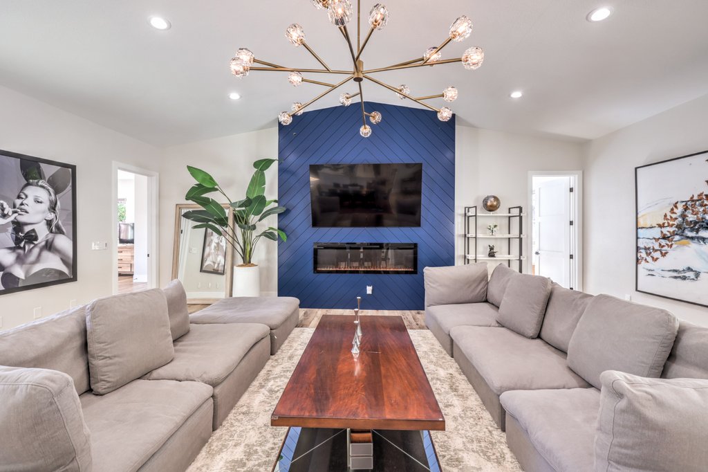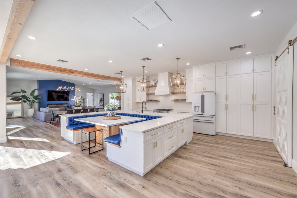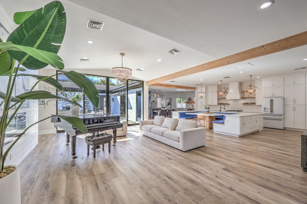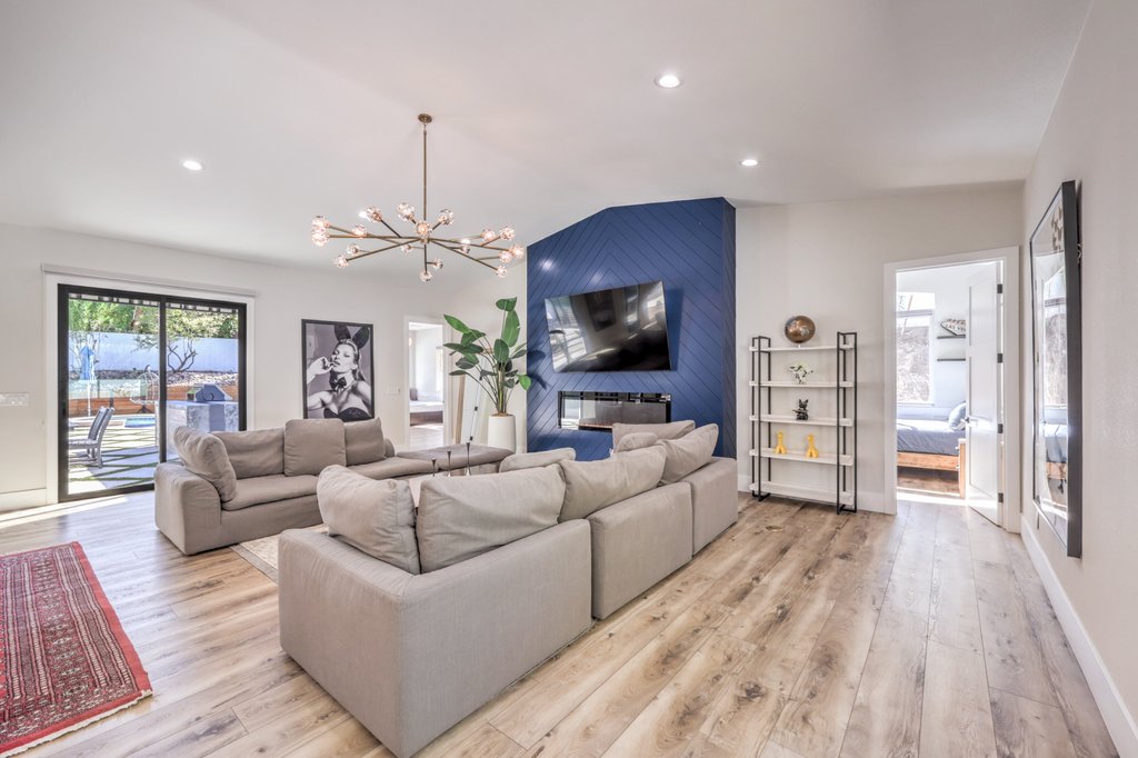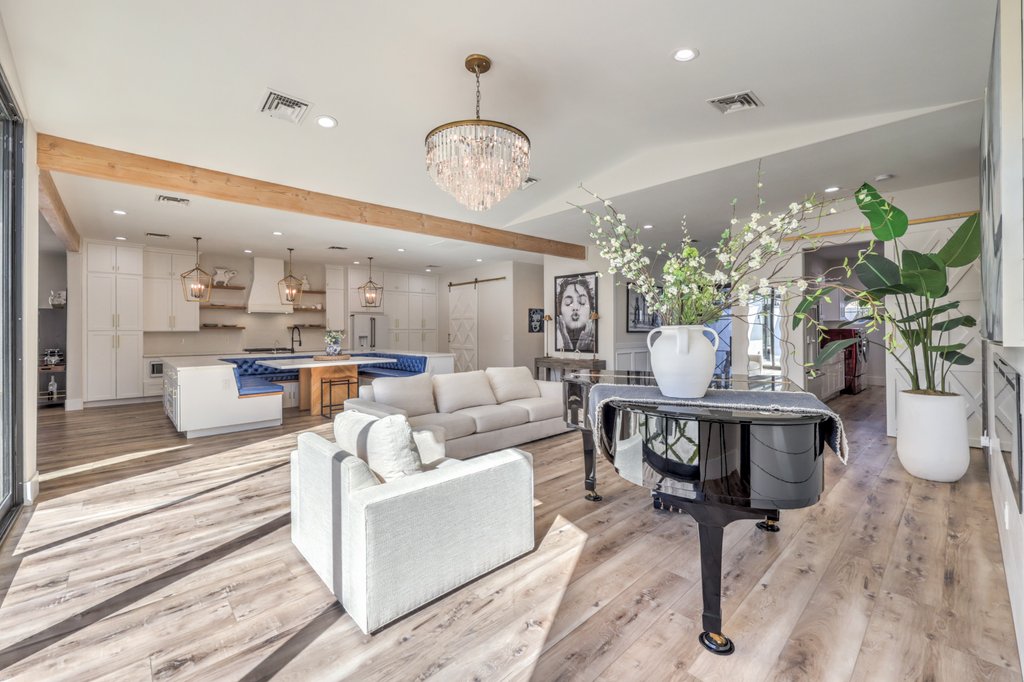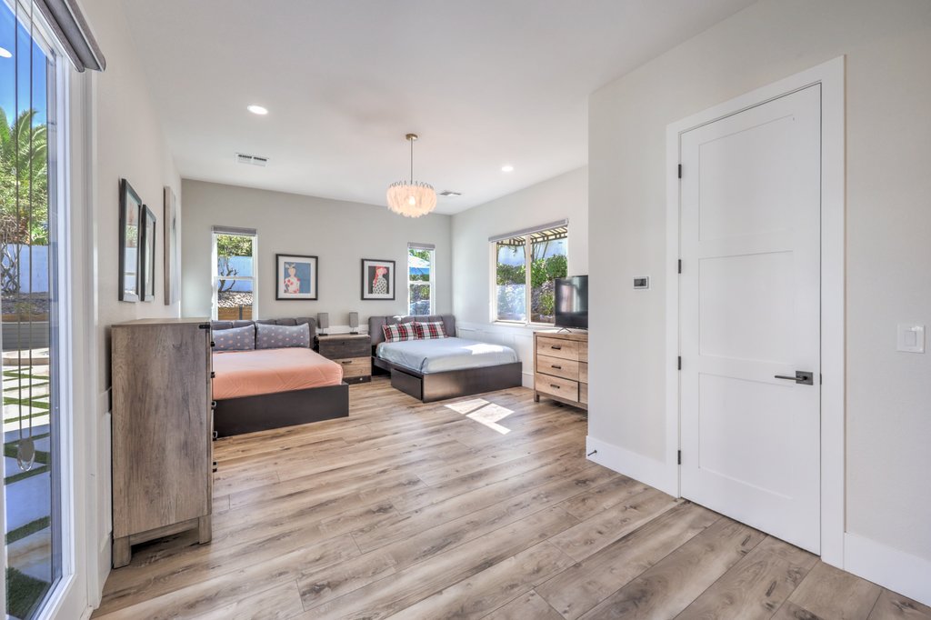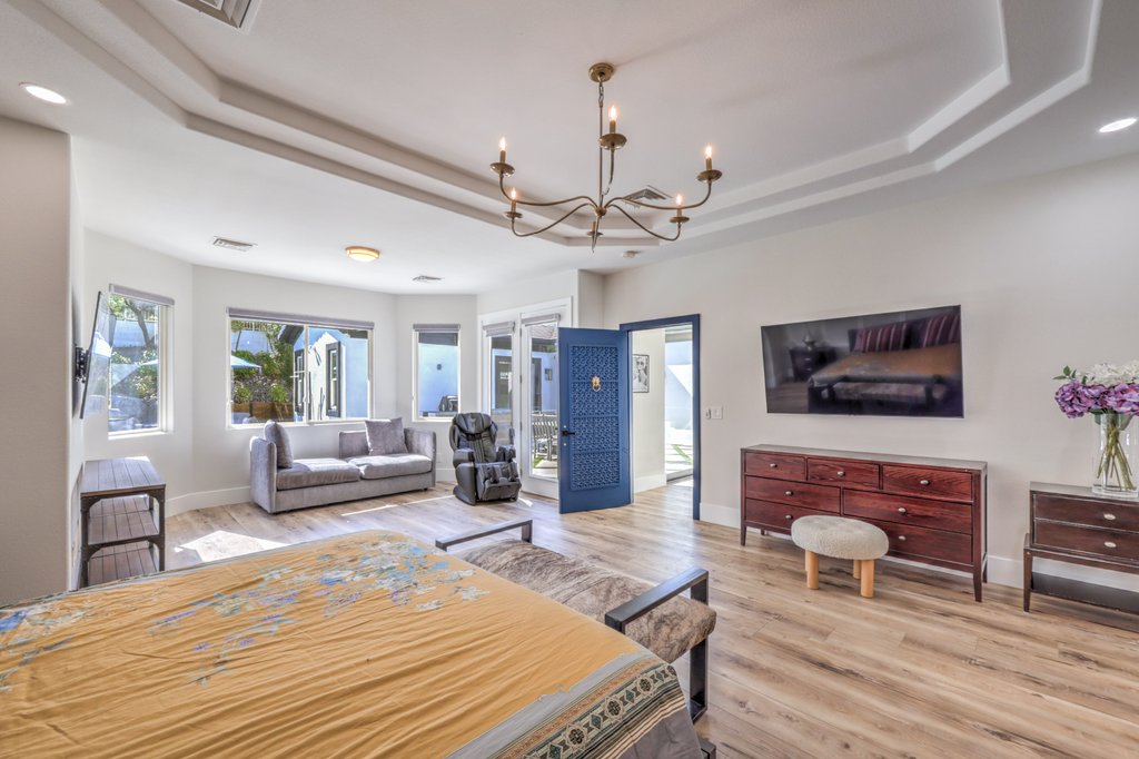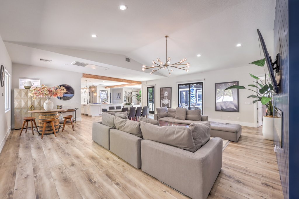 Fully remodeled custom home combines contemporary elegance with a mid-century modern vibe. This turnkey home is offered fully furnished with beautiful, high-end furnishings and select decor. The open concept layout is filled with natural light, ideal for relaxing or entertaining. The gourmet kitchen is highlighted with stacked cabinetry, quartz counters, Kraus sink, island with dining booth, and GE Cafe matte-white stainless-steel appliances. The primary suite is a spa-like retreat thanks to the freestanding round tub, body-jet shower, walk-in closet, and French door to the pool. All bedrooms have an en-suite bathroom, and there is a den for added convenience. Luxurious details throughout include plank floors, zebra shades, wood beams, barn doors, shiplap, linear fireplaces, and 10-foot ceilings. Nearly a half-acre lot is complete with a pool, spa, rock slide, patios, built-in BBQ, courtyard, and an extra-large driveway for plenty of parking. Experience resort-style living with a vibrant and friendly feel in this exclusive guard-gated community of just 86 homes. Perfectly located just minutes from The District, Green Valley Ranch Resort, dining, shopping, desirable schools, parks, trails, and the Vegas Silver Knights arena.