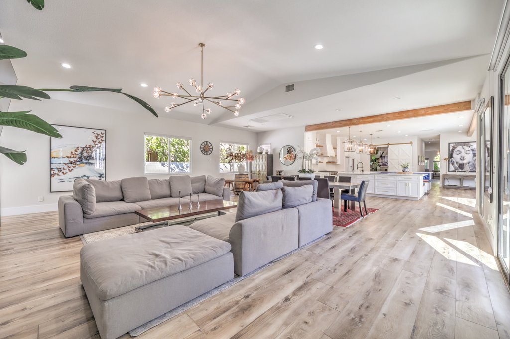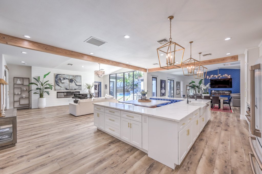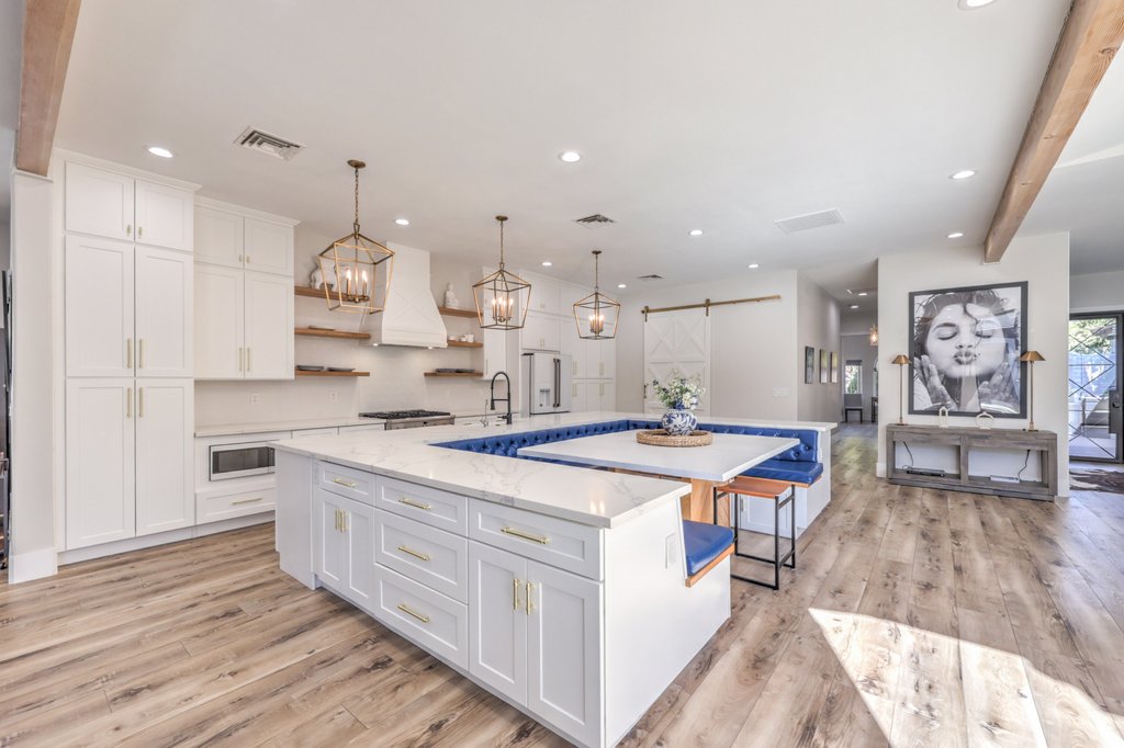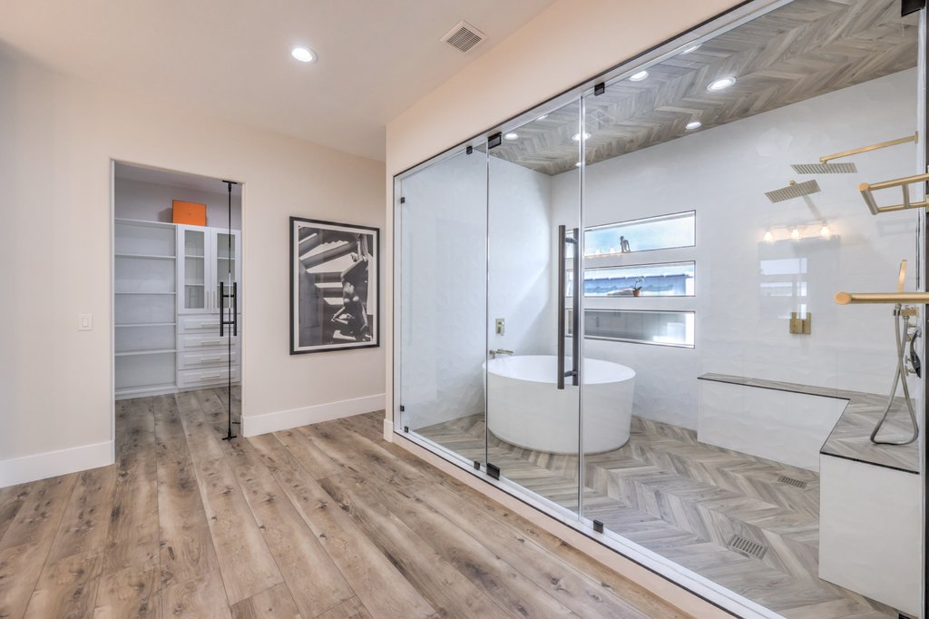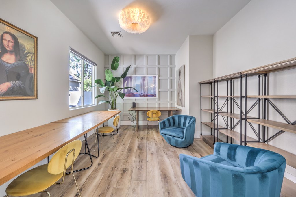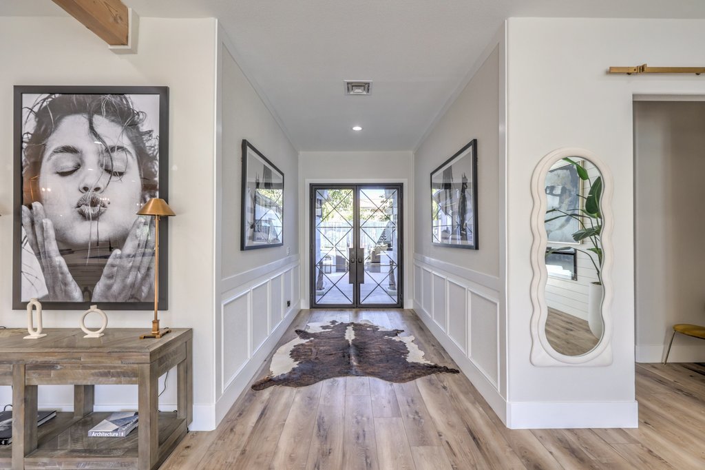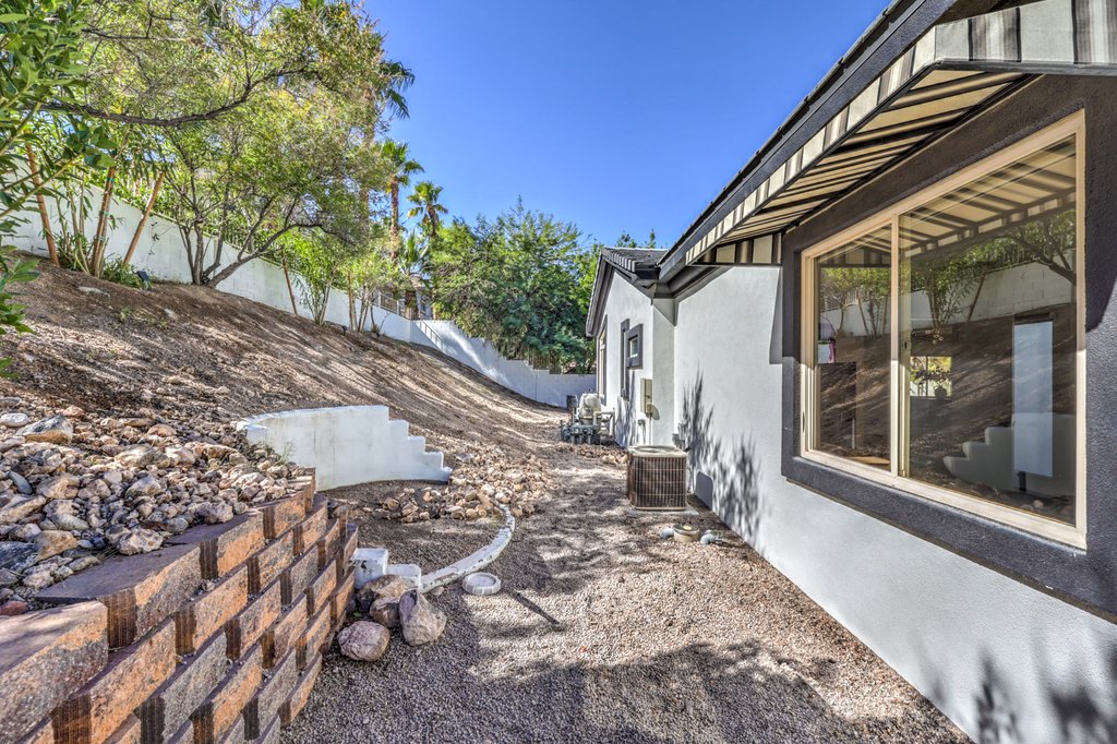 Fully remodeled custom home combines contemporary elegance with a mid-century modern vibe. This turnkey home is offered fully furnished with beautiful, high-end furnishings and select decor. The open concept layout is filled with natural light, ideal for relaxing or entertaining. The gourmet kitchen is highlighted with stacked cabinetry, quartz counters, Kraus sink, island with dining booth, and GE Cafe matte-white stainless-steel appliances. The primary suite is a spa-like retreat thanks to the freestanding round tub, body-jet shower, walk-in closet, and French door to the pool. All bedrooms have an en-suite bathroom, and there is a den for added convenience. Luxurious details throughout include plank floors, zebra shades, wood beams, barn doors, shiplap, linear fireplaces, and 10-foot ceilings. Nearly a half-acre lot is complete with a pool, spa, rock slide, patios, built-in BBQ, courtyard, and an extra-large driveway for plenty of parking. Experience resort-style living with a vibrant and friendly feel in this exclusive guard-gated community of just 86 homes. Perfectly located just minutes from The District, Green Valley Ranch Resort, dining, shopping, desirable schools, parks, trails, and the Vegas Silver Knights arena.